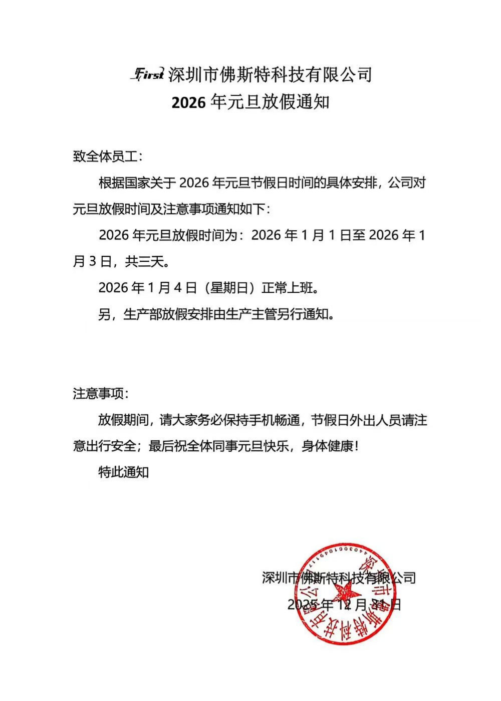 In accordance with the national holiday arrangements for 2026, our company will be closed from January 1st to January 3rd, 2026, for a total of three days. We will resume normal operations on January 4th, 2026 (Sunday). Please note that the production department will have a separate holiday schedule, which will be communicated directly by the production supervisor.